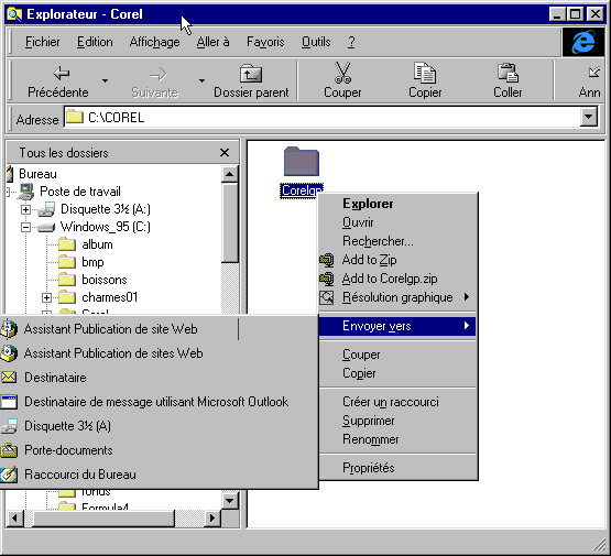 La fenêtre de la commande : "ENVOYER VERS" apparaît, dans une fenêtre distincte évidemment, ce qui vous permet de sélectionner comme destination ensuite la disquette A par exemple.