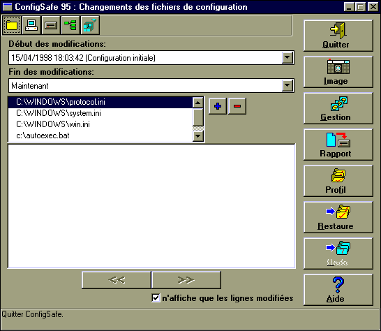 Installez un utilitaire spécifique tel que ConfigSafe (distribué par AB Soft) qui enregistre à intervalles réguliers le registre Windows et tous les autres fichiers importants. Grâce à lui, rétablir une configuration antérieure devient un jeu d'enfant, même si vous deviez redémarrer sous Dos.