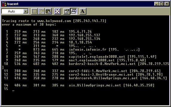 Voici une autre commande, autrement astucieuse. Vous savez que les messages émis sur le Net rebondissent d'un serveur à l'autre jusqu'à ce qu'ils arrivent à destination. Nul ne peut prévoir le chemin qu'ils emprunteront. Vous pouvez suivre un appel à la trace (on dit tracer un appel) avec la commande Windows Trace Route, appelée TRACERT. Elle semble absente de l'aide Windows.